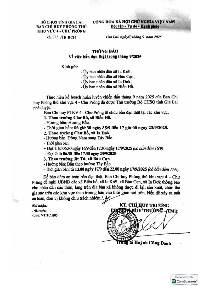 Thứ bảy, 13/09/2025 | 07:28 A- A A+ | Thông báo về việc bắn đạn thật trong tháng 9/2025 Chia sẻ Đọc bài Lưu Ngày 09 tháng 9 năm 2025, Ban Chỉ huy Phòng thủ khu vực 4 - Chư Prông ban hành thông báo về việc bắn đạn thật trong tháng 9/2025. Ban biên tập thông tin nội dung thông báo chi tiết như sau: Từ khóa: thông báo bắn đạn thật